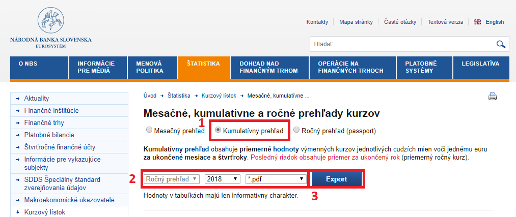 Národná banka Slovenska (ďalej len NBS) na svojich stránkach zverejňuje kumulatívny prehľad, ktorý obsahuje priemerné hodnoty výmenných kurzov jednotlivých cudzích mien voči jednému euru za ukončené mesiace a štvrťroky. Posledný riadok obsahuje priemer za ukončený rok (priemerný ročný kurz).