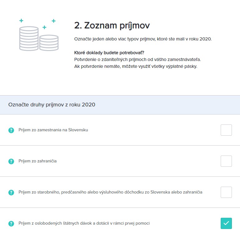Jej zaškrtnutím sa vám pri ďalšom vypĺňaní otvorí možnosť uvedenia konkrétnych príjmov podľa druhu príspevku, ktoré sme vymenovali vyššie.